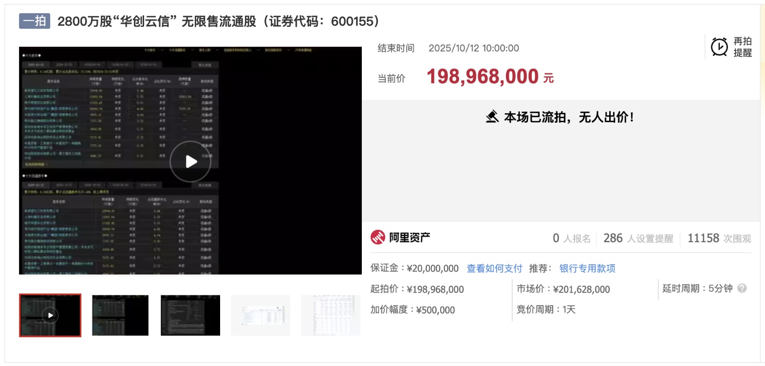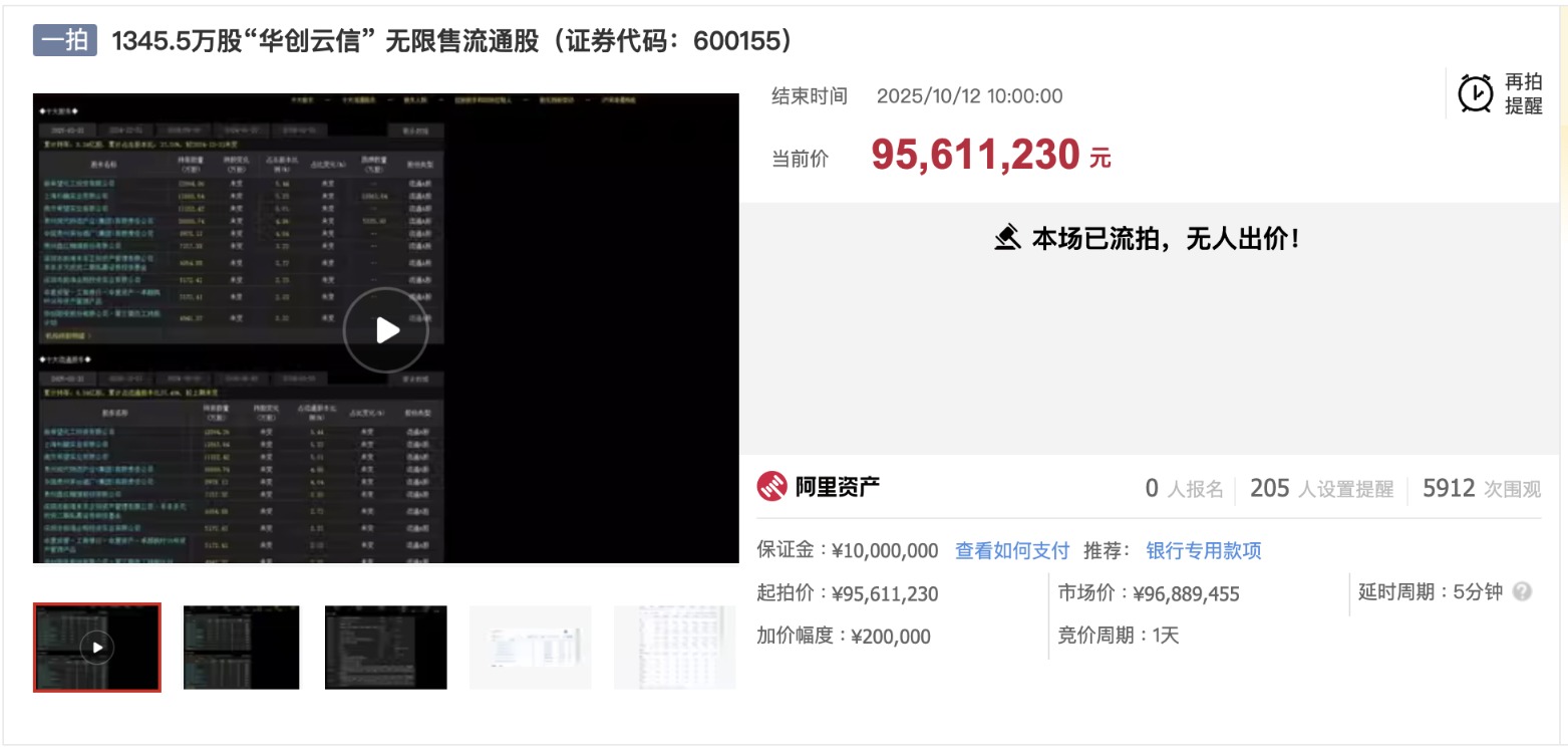 10月12日,华创云信(600155)公告,公司前期披露了关于公司股东部分股份将被司法拍卖的提示性公告,上海市浦东新区人民法院于2025年10月11日10时起至12日10时止在“淘宝网”司法拍卖网络平台对上海杉融实业有限公司持有的公司41,455,000股(占公司总股本比例1.87%)无限售流通股进行公开拍卖。
