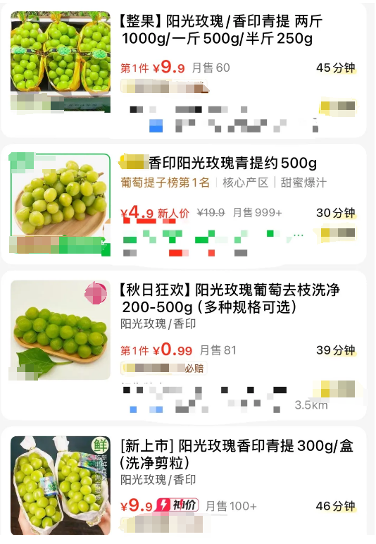 而在平台上搜索广州的阳光玫瑰售价,可以看到有商家推出200-500g/0.99元的活动。