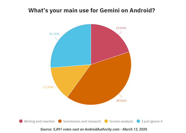 令人惊讶的是,有26%(1547名)网友表示完全无视Gemini服务,没有使用习惯,比例之高让Android Authority也吓了一跳。