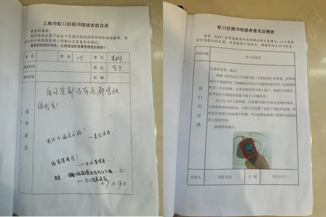 最近,上海虹口区图书馆的读者留言本突然走红。上面的字迹从稚嫩到工整,诉求从卫生间缺纸到空调温度过高,五花八门的诉求充满生活气息。暖心的是,这些留言都得到了回复↓