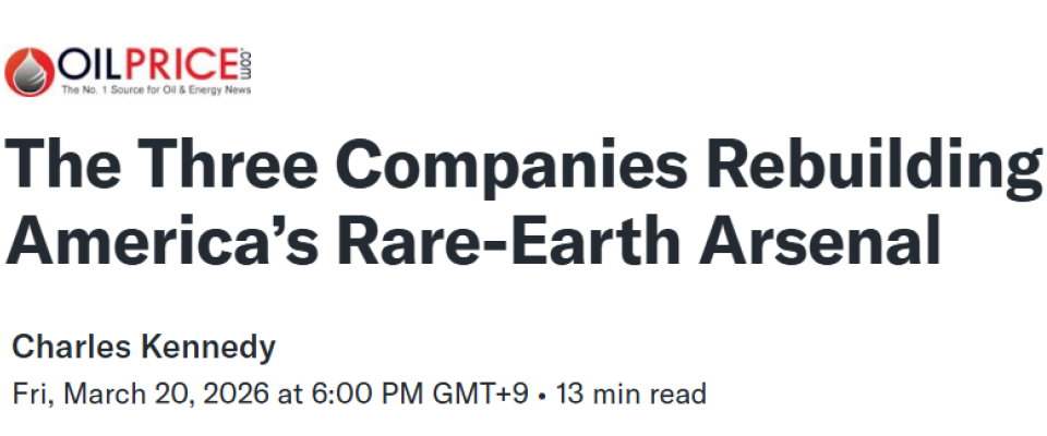 3月20日《OILPRICE》网站发表分析文章称,三家美国小型公司正在悄然重建现代经济中最具战略意义的供应链之一——美国稀土供应链,为导弹、战斗机、电动汽车和先进制造业中的稀土金属和稀土磁铁输送原料。