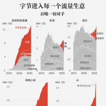 · 另一个利润粉碎机是字节跳动。它进入了一个又一个依赖流量的市场,先抢走了对手的用户,再挤压对手的利润。短视频、影视、音乐、网络小说,字节系产品的用户规模都是第一;豆包 2 月平均日活跃用户数超过其他几个中国 AI 助手之和。其他公司在一两个战场苦战,字节同时赢下了五个。