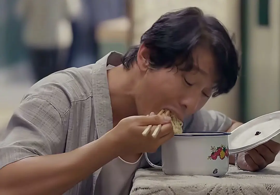 郑德诚吃面那段,是黄晓明在这部剧中演技封神的一段表演,虽只是简单几秒钟吃面,可从筷子搅拌面条,到筷子夹面停在半空抬头说话,再到张大嘴,一大口嗦面,一气呵成的动作完全就是工人干活专用的状态,一眼过去就很有代入感。