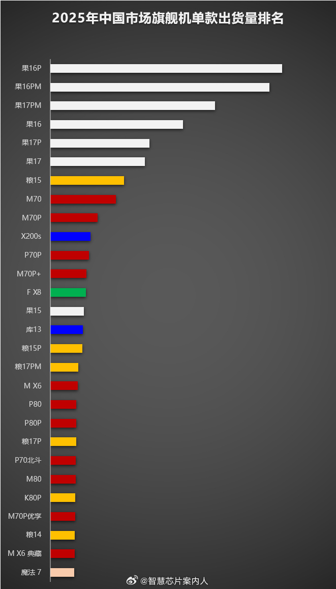 根据知名数码博主统计的一份中国市场旗舰机单款出货量排名,2025年出货量超过百万的机型大约有28款,其中华为独占11款,包括华为Mate 70系列多款机型、华为P70系列、华为Mate 80系列多款机型以及华为折叠屏Mate X6系列两款机型。