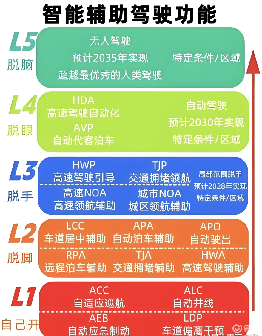 根据国家标准《汽车驾驶自动化分级》(GB/T40429-2021),L0-L2级均属于“辅助驾驶”范畴,系统只是辅助,驾驶主体始终是人。L3级才进入“有条件自动驾驶”,责任主体开始向系统转移——但即便如此,L3级仍要求驾驶人在系统请求时随时接管。